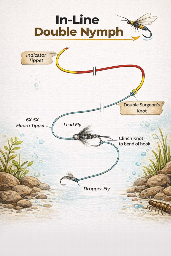 - Dropper: 4 to 6 inches of 6x fluorocarbon off a surgeon’s knot tag, positioned 18 to 24 inches above the lead fly