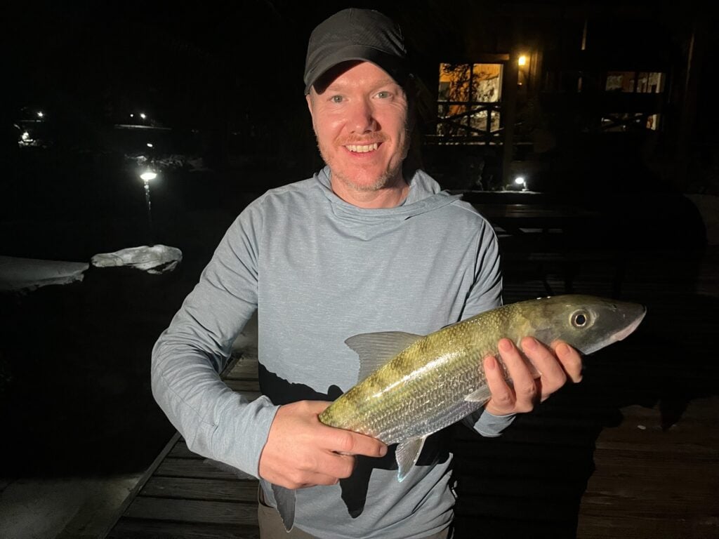 Then Chris hooked something that fought completely differently. No acrobatics, no aerial runs, just steady, stubborn pulling. I hand-grabbed it off the rocks. A bonefish. At night. Off the dock.